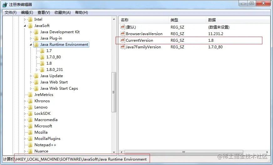 Software\JavaSoft\Java Runtime Environment\CurrentVersion当前值是 1.8,但是 java 命令版本是 1.7