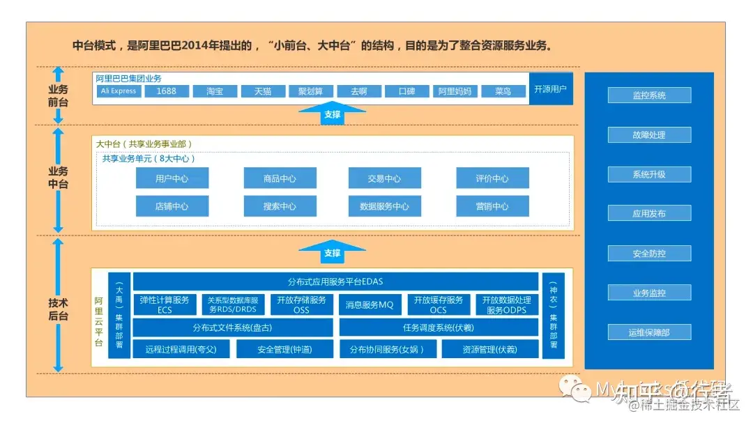 这给大家带来很大触动,从此,阿里巴巴开始思考在新的数字时代企业所需要的经营模式。半年后,时任集团CEO的张勇内部发文,表示阿里巴巴将全面升级组织架构,建设能够整合产品技术、数据分析等业务能力的大中台,同时搭建“大中台,小前台”的生产服务架构与业务体系。将产品技术和数据运营能力从前台分离,成立单独的中台部门,包括搜索事业部、共享业务事业部、数据平台事业部等。前台功能板块得到精简,保持足够的灵活性,从而满足业务的发展和快速创新。