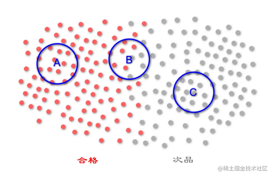 那我们看到,A圈识别的很对,圈中的样本代表合格,它都识别对了。B圈差点儿意思,将一些次品也识别成合格了。C圈整个完蛋,黑白颠倒,识别的所有合格,实际上全是次品(这种考核完全是逼优秀的人离职的节奏)。