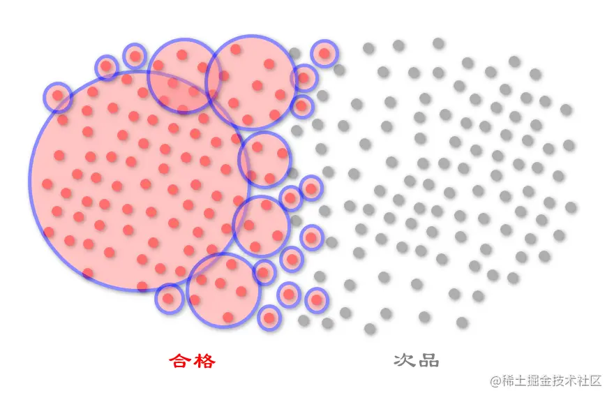我们从上帝视角看,红色的点代表合格,灰色代表不合格。其实,程序是不知道底牌的。