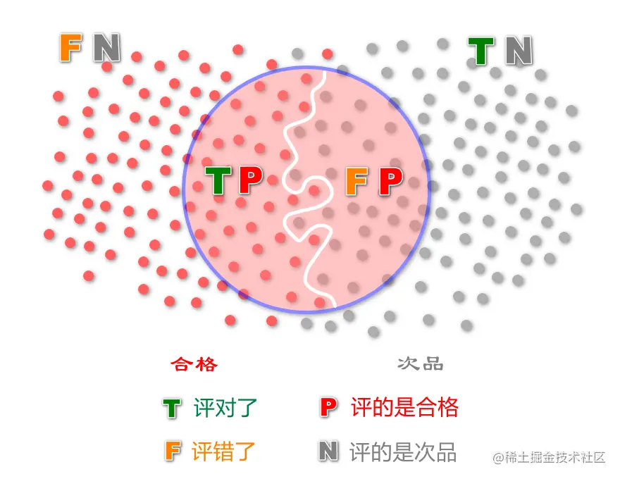第一,它识别对了。我们用T也就是true表示它成功了。这里面其实还分为两种情况:1、把实际上合格的,判定成了合格。这个判定的合格我们叫P,也就是positive。那么这类情况就是TP;2、判定为合格之外的那些样本,实际上它也真的不合格(Negative)。那这类也算是评对了,我们把这类叫做TN。