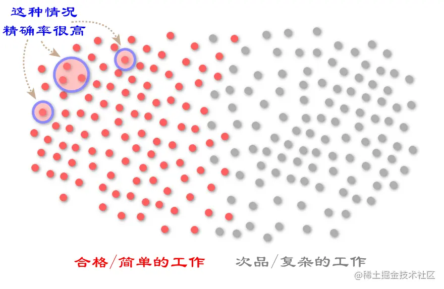 也就是说,高精确率虽然强调,要把每一件经手的事情干好,但是也有一个逻辑漏洞:干100件事和干1件事并不重要,不出错才重要。这可能会导致,少干才会少出错,而且拣着容易的活干也会少出错。