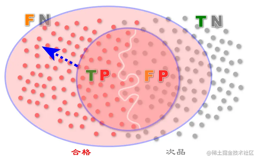 “我们用F也就是false表示它出错了。判定为合格之外的那些样本,实际上也有合格的,但是你认为它不合格,判定了Negative,这类叫做FN。”
