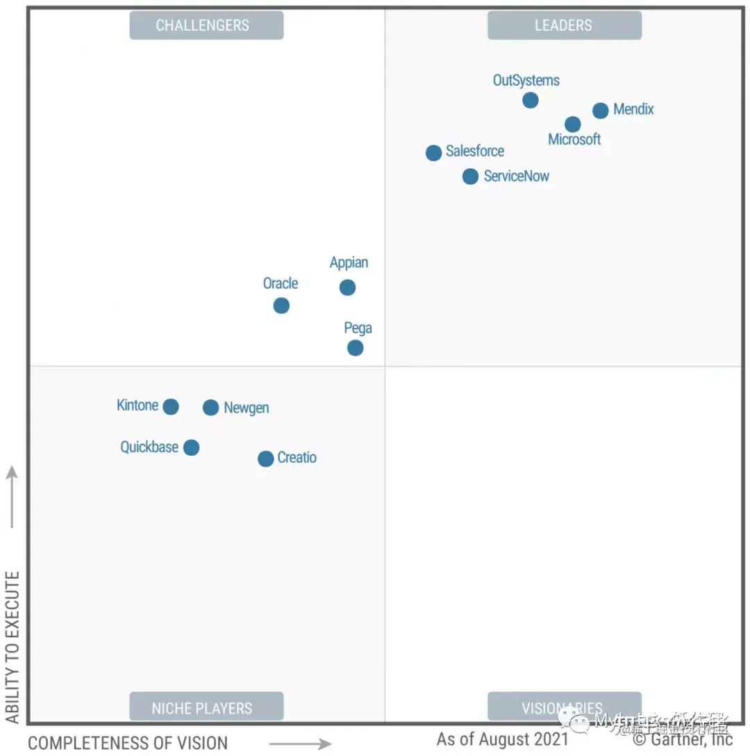 在Gartner发布的《2021年企业低代码应用平台(LCAP)魔力象限》中,Gartner通过产品操作、服务、市场反馈、用户影响力、客户体验、营销执行等多个维度对全球知名低代码厂商进行了严格评选,最终结果如下图。