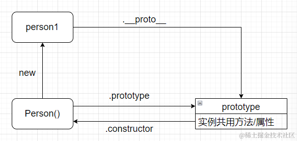 当构造函数new出一个实例的时候,实例的身上会有一个__proto__属性,也是我们俗称的隐式原型,并且这个属性会指向它的构造函数的原型对象prototype