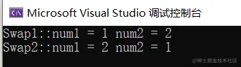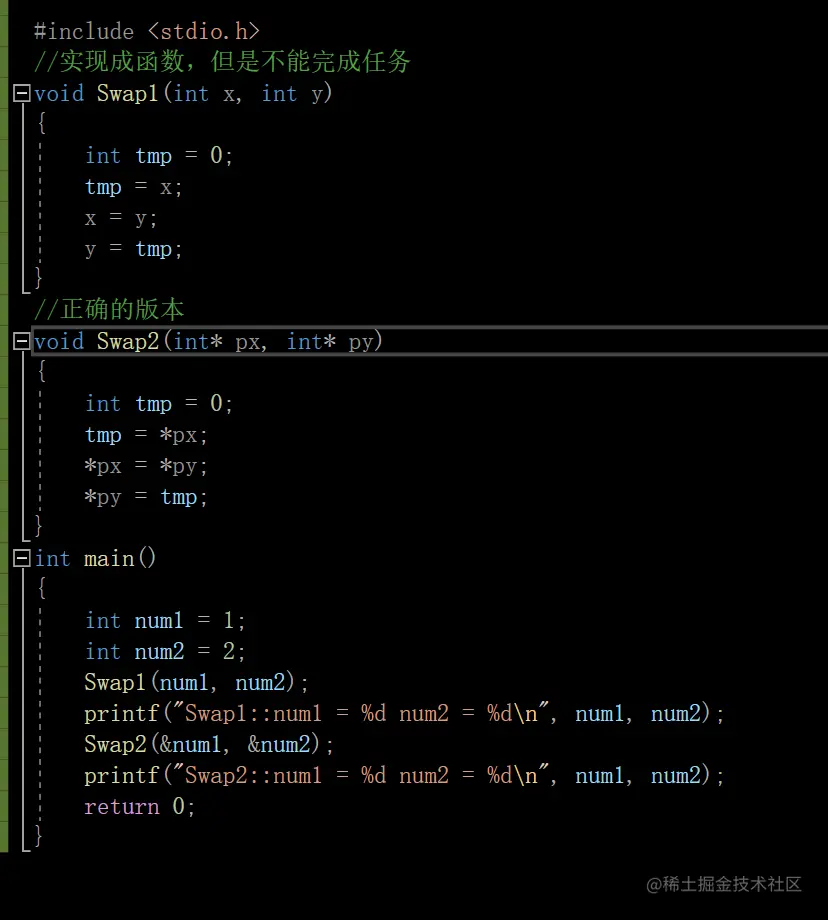 上面 Swap1 和 Swap2 函数中的参数 x,y,px,py 都是形式参数。在main函数中传给 Swap1 的 num1 , num2 和传 给 Swap2 函数的 &num1 , &num2 是实际参数。