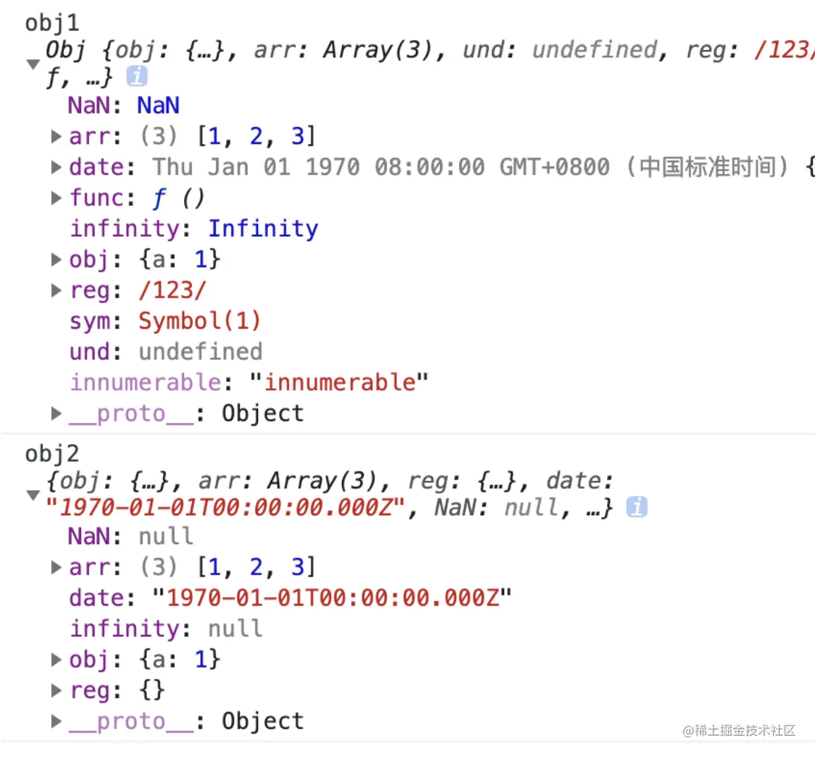 我们看一下结果,cloneObj 在 obj 的基础上进行了一次深拷贝,cloneObj 里的 arr 数组进行了修改,并未影响到 obj.arr 的变化,如下图所示