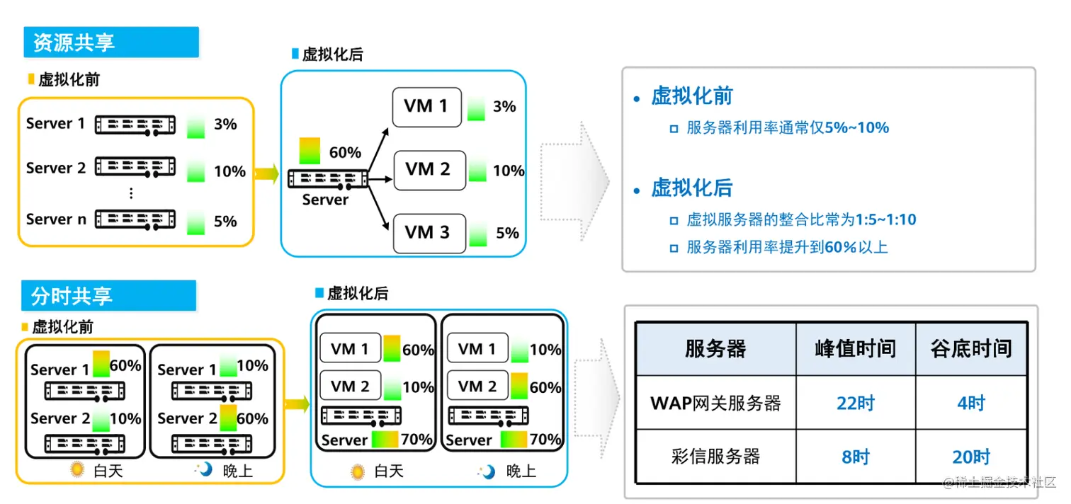 •通过资源共享和分时共享解释,回归本页主题,虚拟化能够明显提高资源利用率,降低投资成本并提高投资回报率。
