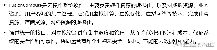 ▫FusionCompute是云操作系统软件,主要负责硬件资源的虚拟化,以及对虚拟资源、业务资源、用户资源的集中管理。它采用虚拟计算、虚拟存储、虚拟网络等技术,完成计算资源、存储资源、网络资源的虚拟化。同时通过统一的接口,对这些虚拟资源进行集中调度和管理,从而降低业务的运行成本,保证系统的安全性和可靠性,协助运营商和企业构筑安全、绿色、节能的云数据中心能力。