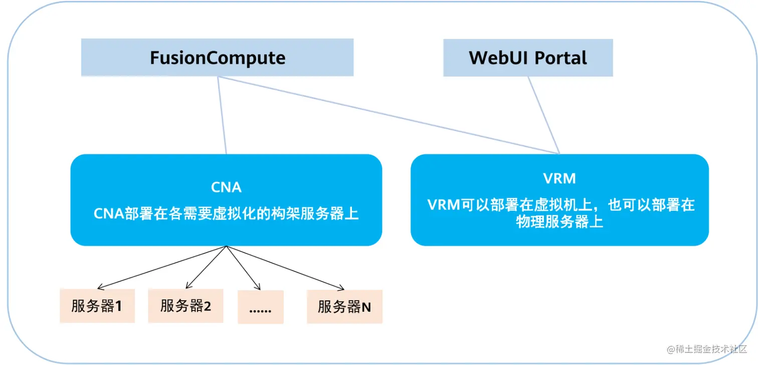 •VRM英文全称:Virtual Resource Management,VRM可以部署在VM上或者部署在物理服务器上;VRM对外提供网页操作界面给管理维护人员。