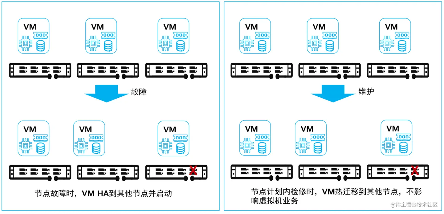 •当业务虚拟机所在的主机发生故障或需要人工维护时,FusionCompute能够第一时间检测到异常,并把异常机器上运行的虚拟机在集群中其他正常的主机上面重新启动,保障业务连续性。