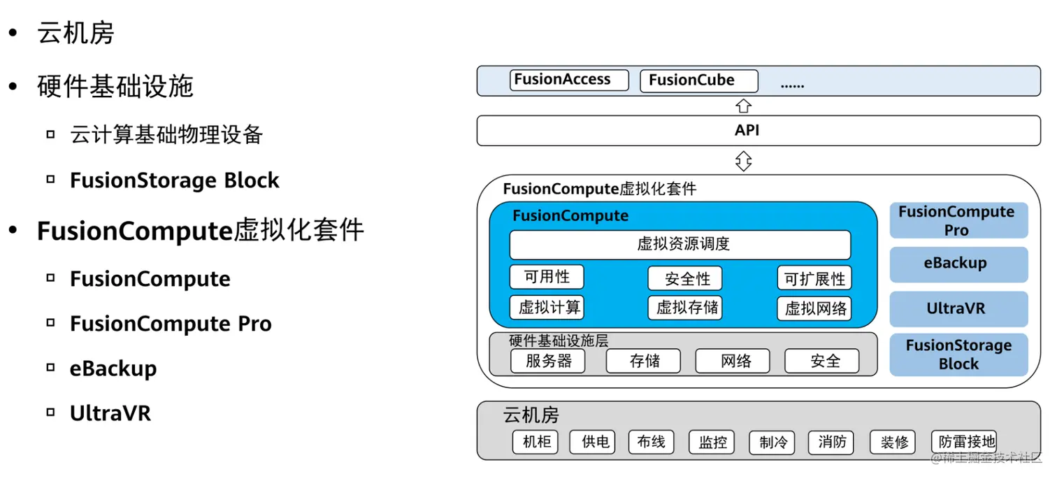 •云机房:为云数据中心运营所提供的一系列基本配套设施和空间,主要包括供电系统、消防系统、布线系统、制冷系统等。