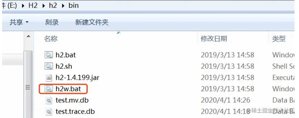 我们可以进入到h2的bin目录下,点击h2.bat或者h2w.bat,运行软件。我这里选择的是点击h2w.bat,该方式会在后台运行。
