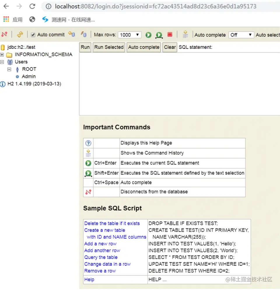 当我们点击H2的”连接“按钮,当用户名密码正确的情况下,就可以成功地进入到H2的web控制台界面。