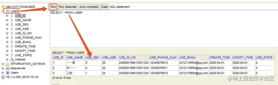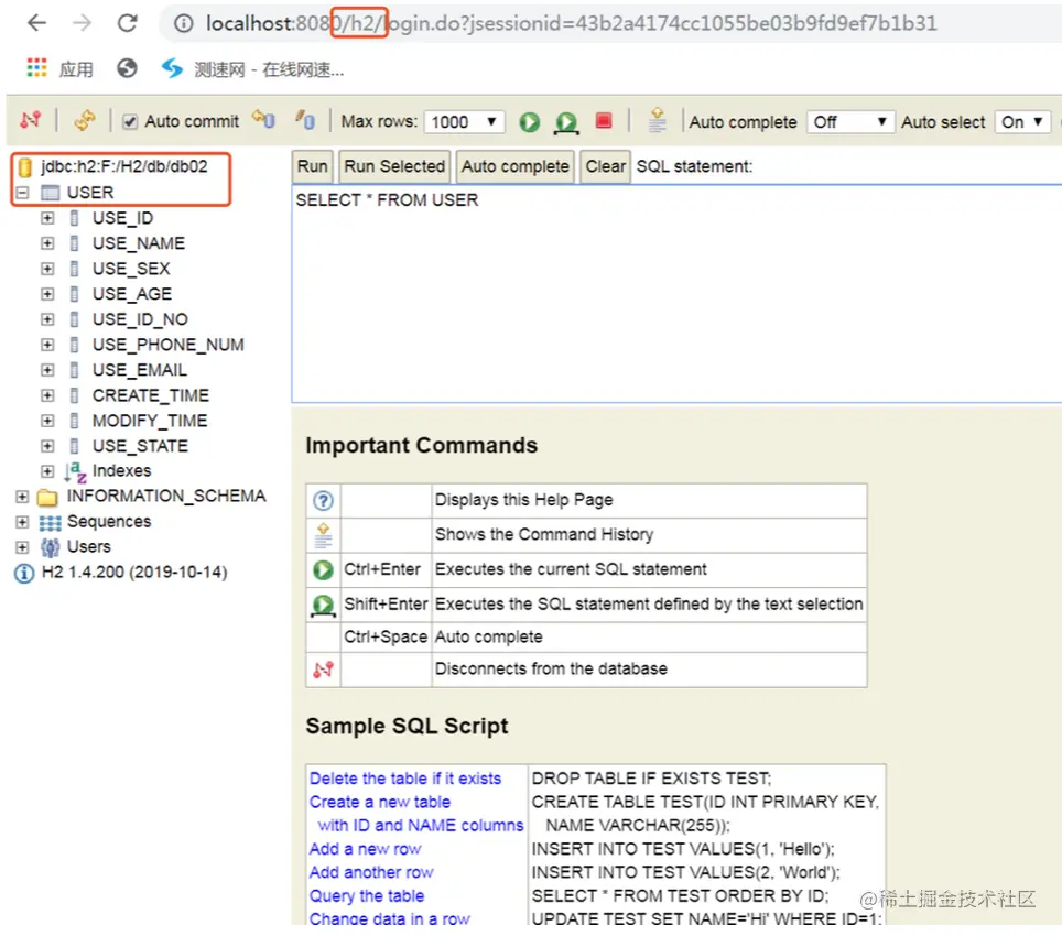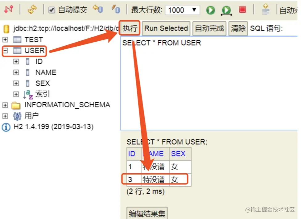 进入到H2的web控制台,可以在Web控制台中看到插入了一个新的数据。