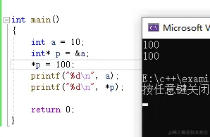 正如你们所想,a的值被改成了100和p的值一样,因为p的值指的就是a的地址,所以把*p赋值100,a也被赋值了100