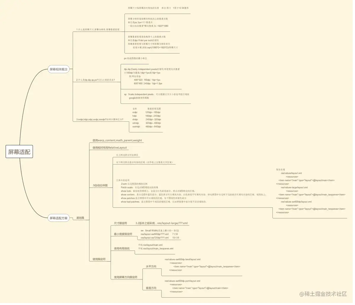 那么下面是我给大家写的一个屏幕适配基础的思维导图,基本为一个基础篇的大纲,这里我不会在课上非常详细的给大家去过,就全部体现在简书当中