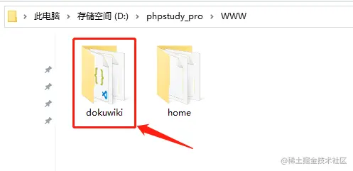 在这些软件安装开启后,我们就可以将DokuWiki的网页文件,放置到phpstudy搭建的网页环境中。在本地电脑找到下载好的DokuWiki压缩包,并将其解压。接着将解压后的dokuwiki文件夹,整个粘贴到phpstudy的WWW文件夹下。笔者的phpstudy是安装在D盘下,所以本例就移动到(D:) > phpstudy-pro > WWW文件夹内。