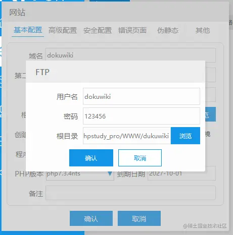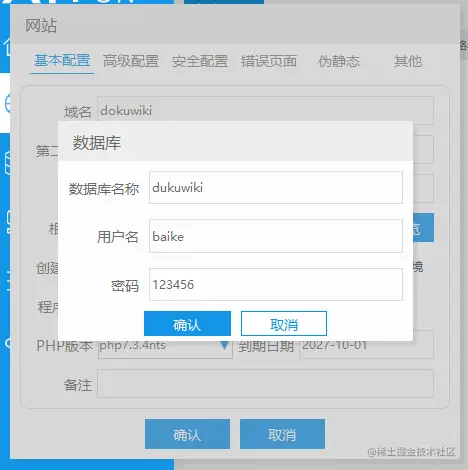 接着是FTP和数据库的设置,在“创建环境”行勾选“创建FTP”和“创建数据库”项,就会分别跳出这两个项目的设置页面。为防止混淆,本例中将FTP用户名设置为“dokuwiki”,密码则选择简单密码;而数据库名称dukuwiki是自动生成的,我们不必更改,用户名和密码也可以选择自己喜欢的输入(我们需要记住用户名和密码,用于其后网页安装时填入)。完成这几项后,就能点击页面下方的“确认”,建立网页运行环境。