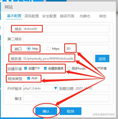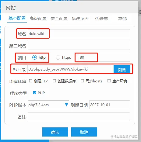 网页文件移动完成后,我们回到phpstudy主界面,点击左侧的“网站”按钮,为DokuWiki设定运行环境。在这个页面,我们需要进行几项设置。包括域名、端口、根目录、数据库、FTP几项。首先是“域名”,这个域名会显示在局域网访问地址中,为方便起见,这里设置为“dokuwiki”;“端口”项我们选择“http”,端口号填入“80”(80是默认选择,我们也可以选择未被占用的端口输出网页);而“根目录”就是dokuwiki网页文件夹,可以点击右侧的“浏览”按钮进行选择。