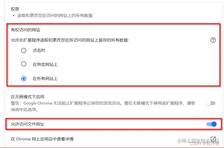 点击Chrome 浏览器右上角的编辑按钮,选择更多工具-> 扩展程序-> Vue.js devtools 详细信息,并勾选如下