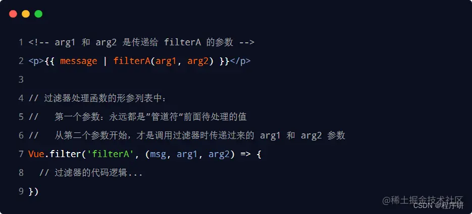 过滤器的本质是JavaScript 函数,因此可以接收参数,格式如下: