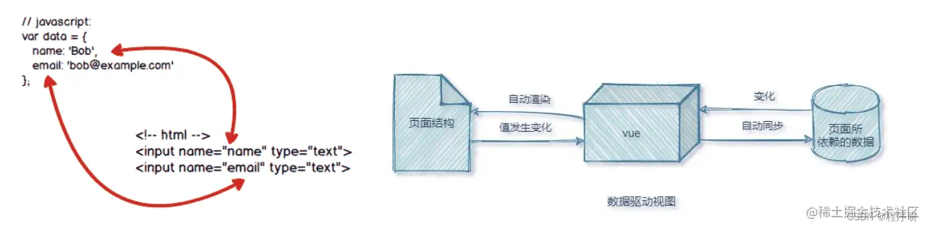 在填写表单时,双向数据绑定可以辅助开发者在不操作DOM 的前提下,自动把用户填写的内容同步到数据源