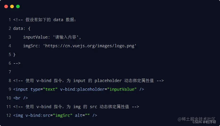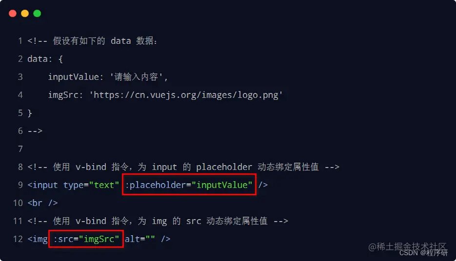 如果需要为元素的属性动态绑定属性值,则需要用到v-bind属性绑定指令。用法示例如下: