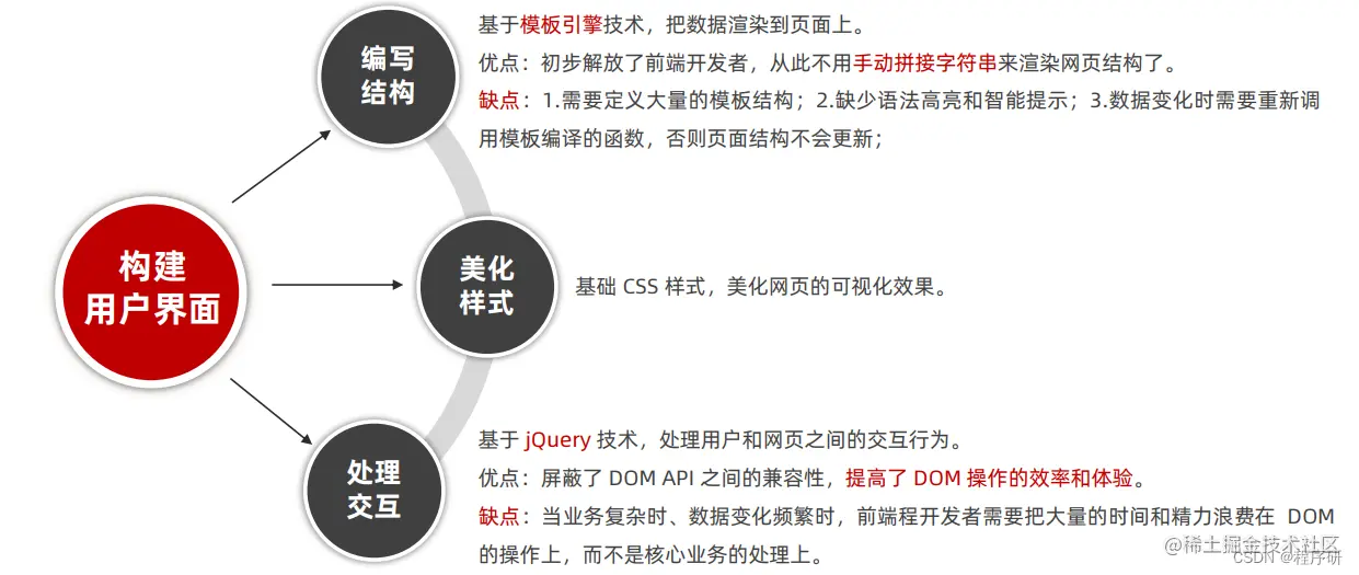 在传统的Web 前端开发中,是基于jQuery + 模板引擎的方式来构建用户界面的。