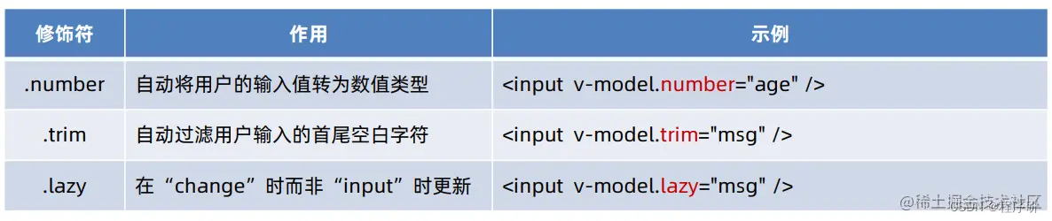 为了方便对用户输入的内容进行处理,vue 为v-model 指令提供了3 个修饰符,分别是: