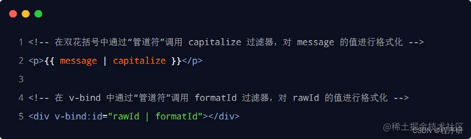 过滤器应该被添加在JavaScript 表达式的尾部,由“管道符”进行调用,示例代码如下: