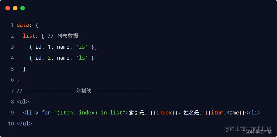 v-for 指令还支持一个可选的第二个参数,即当前项的索引。语法格式为(item,index)in items,示例代码如下: