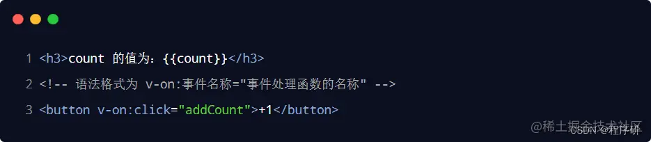 vue 提供了v-on 事件绑定指令,用来辅助程序员为DOM 元素绑定事件监听。语法格式如下: