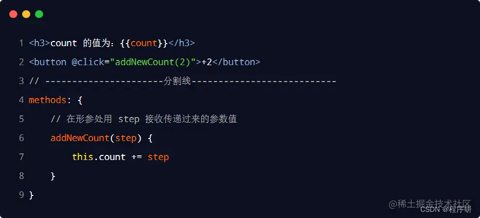 在使用v-on 指令绑定事件时,可以使用**( )**进行传参,示例代码如下: