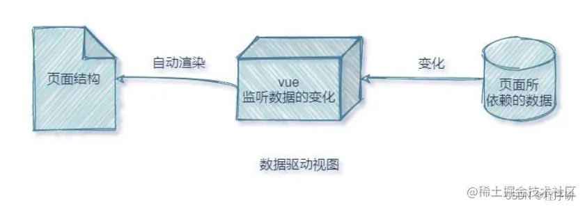 在使用了vue 的页面中,vue 会监听数据的变化,从而自动重新渲染页面的结构。示意图如下: