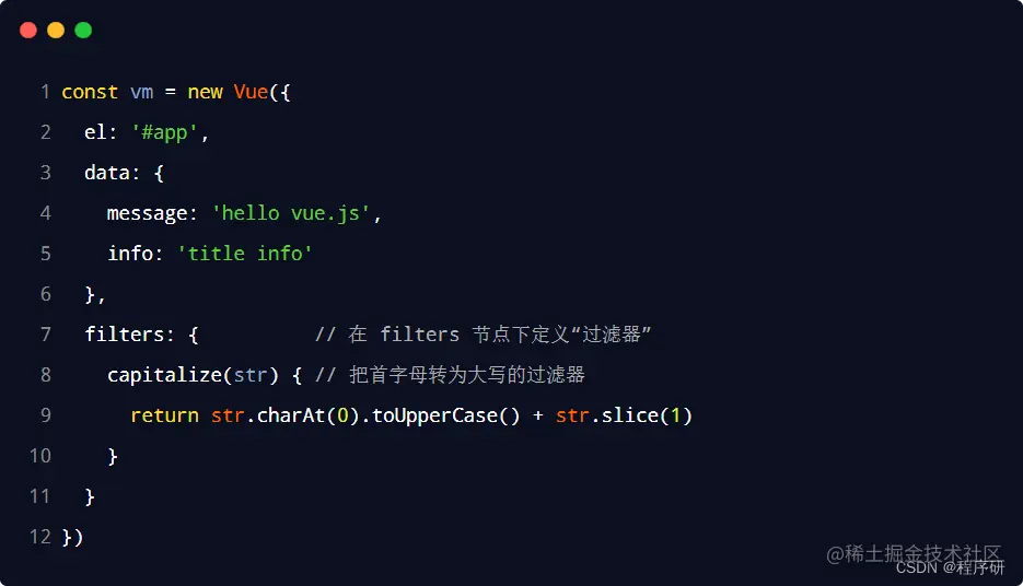 在创建vue 实例期间,可以在filters 节点中定义过滤器,示例代码如下: