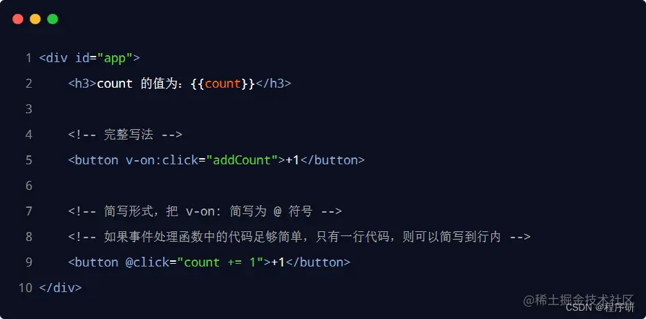 由于v-on 指令在开发中使用频率非常高,因此,vue 官方为其提供了简写形式(简写为英文的**@**)。