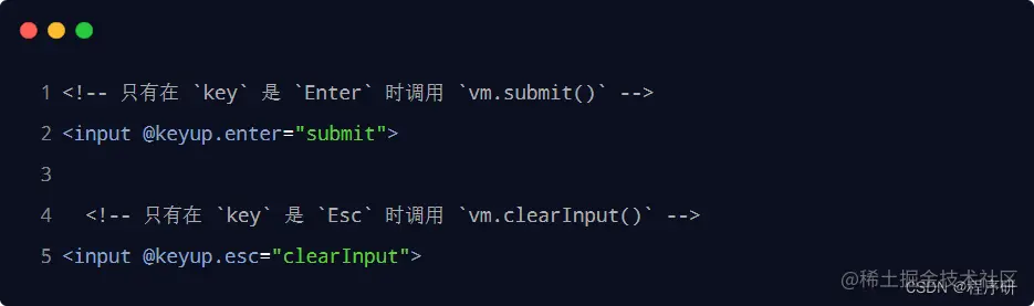 在监听键盘事件时,我们经常需要判断详细的按键。此时,可以为键盘相关的事件添加按键修饰符,例如: