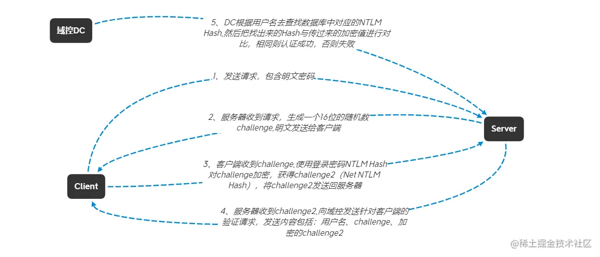 NTLM网络认证采用挑战/响应(Challenge/Response)的消息交换模式,流程如下: