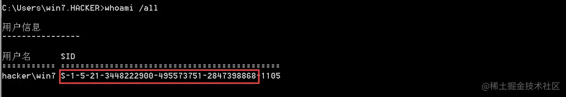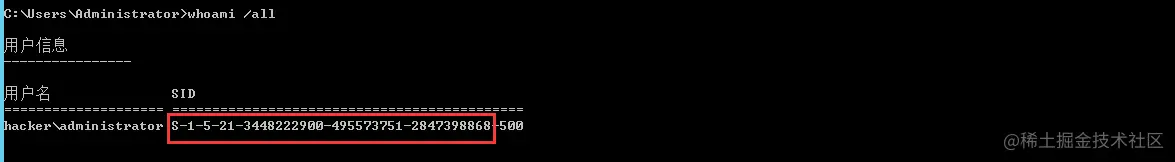 whoami /user 获取域的sid值(去掉最后的-500,500表示为administrator用户)