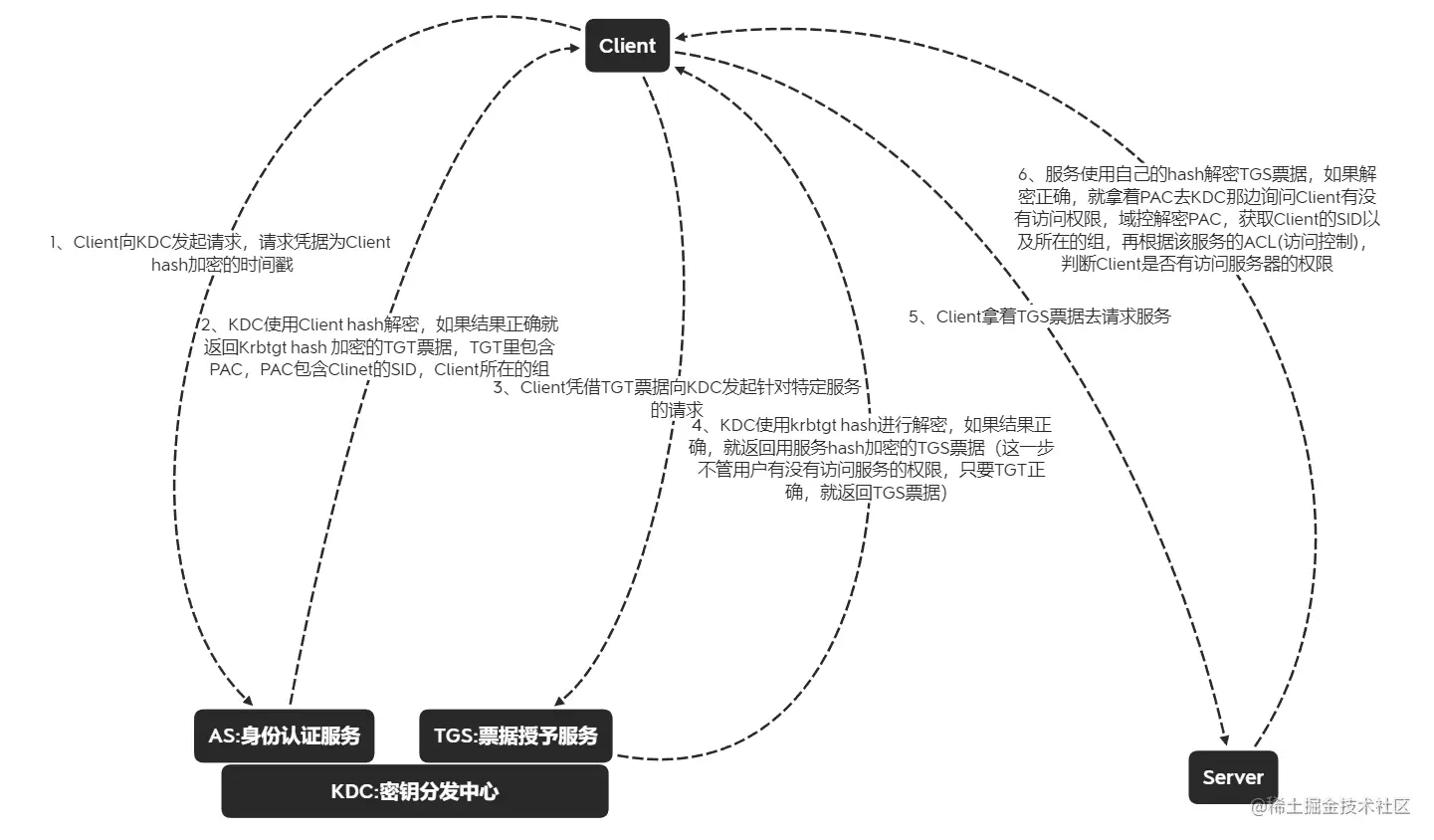 6、服务使用自己的hash解密TGS票据,如果解密正确,就拿着PAC去KDC那边询问Client有没有访问权限,域控解密PAC,获取Client的SID以及所在的组,再根据该服务的ACL(访问控制),判断Client是否有访问服务器的权限