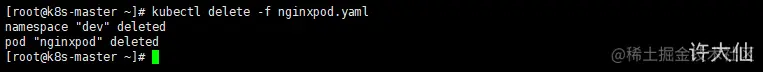 - 示例:删除指定namespace下的指定Pod。删除了namespace,那么该namespace下的所有的pod都删除了