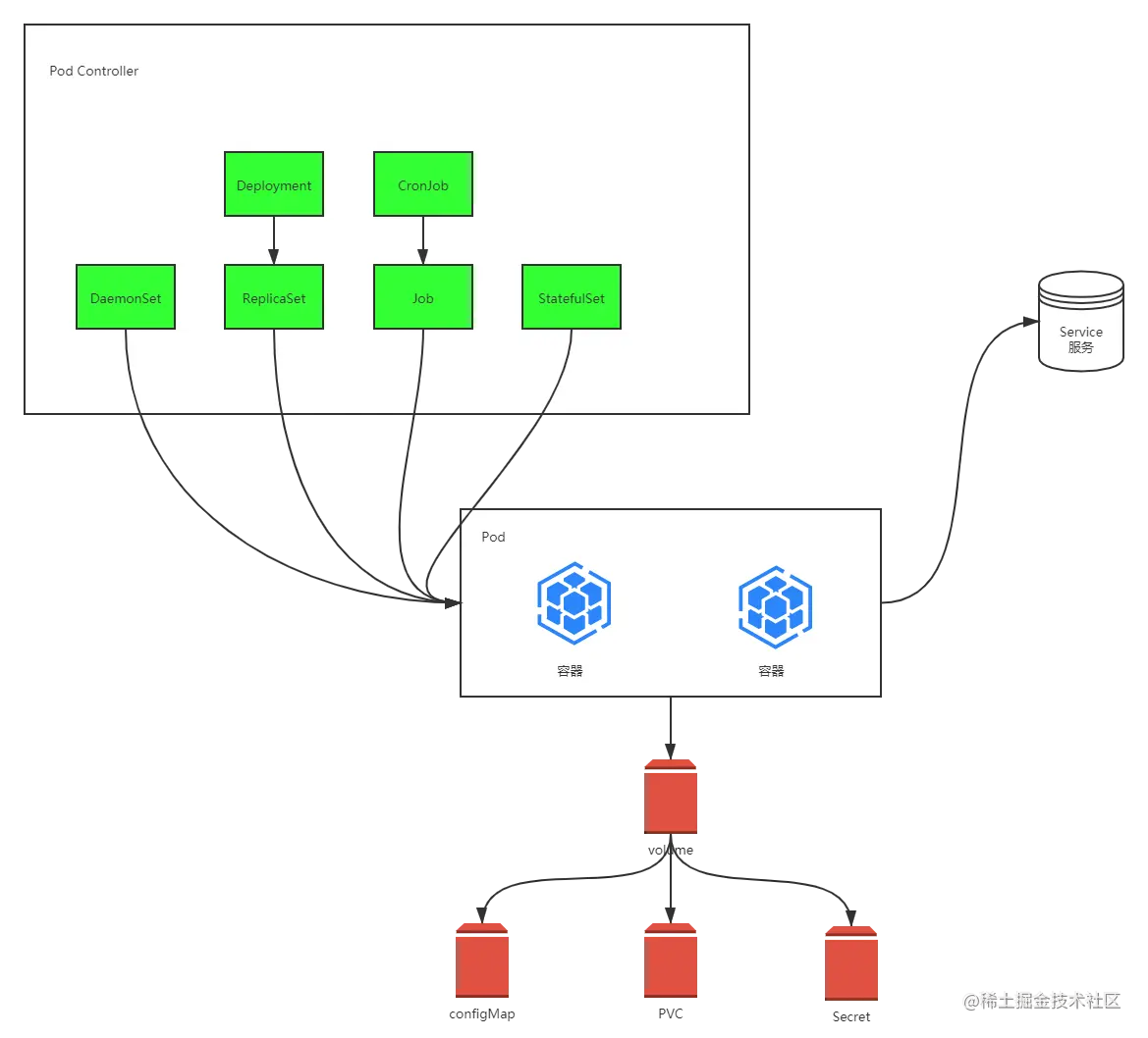 - Kubernetes的最小管理单元是Pod而不是容器,所以只能将容器放在Pod中,而Kubernetes一般也不会直接管理Pod,而是通过Pod控制器来管理Pod的。