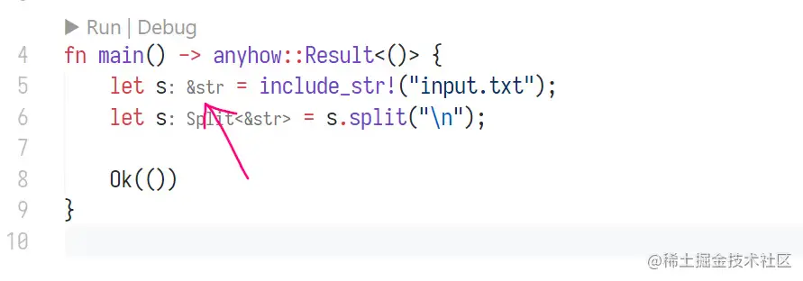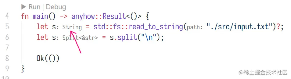 它给我们的不是一个字符串数组,而是一个实现了 Iterator<Item = &str> 的具体类型(Split<&str>)。
